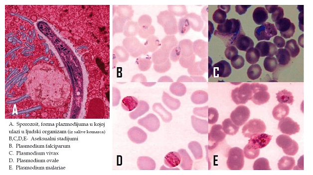 Kada komarac ubode osobu, putem pljuvačke, u čovekov krvotok unosi sporozoit, koji još uvek nije prešao u odrasli stadijum plazmodijuma. Sporozoiti se putem krvotoka šire po organizmu i ubrzo završavaju u jetri. Ćelije jetre koriste za trasformaciju u odrasli stadijum, uzimajući hranljive materije iz jetre, a zatim zaražavaju okolne ćelije jetre. Zaražena osoba u ovom stadjumu nema nikakv simptome. Kada se prenamnože, kreću na eritrocite i njihovim napadom dovode do njihovog propadanja, što alarmira imuni sistem i javljaju se temperatura, groznica i malaksalost. Neke od jedinki prestaju da se dele i diferenciraju se u nezrele gamete, čime završavaju životni ciklus u telu zaražene osobe. Njihovo dalje širenje je moguće ukoliko zaraženu osobu ponovo ujede komarac, koji će sa krvlju pokupiti i nezrele gamete i preneti ih na sledeću osobu.